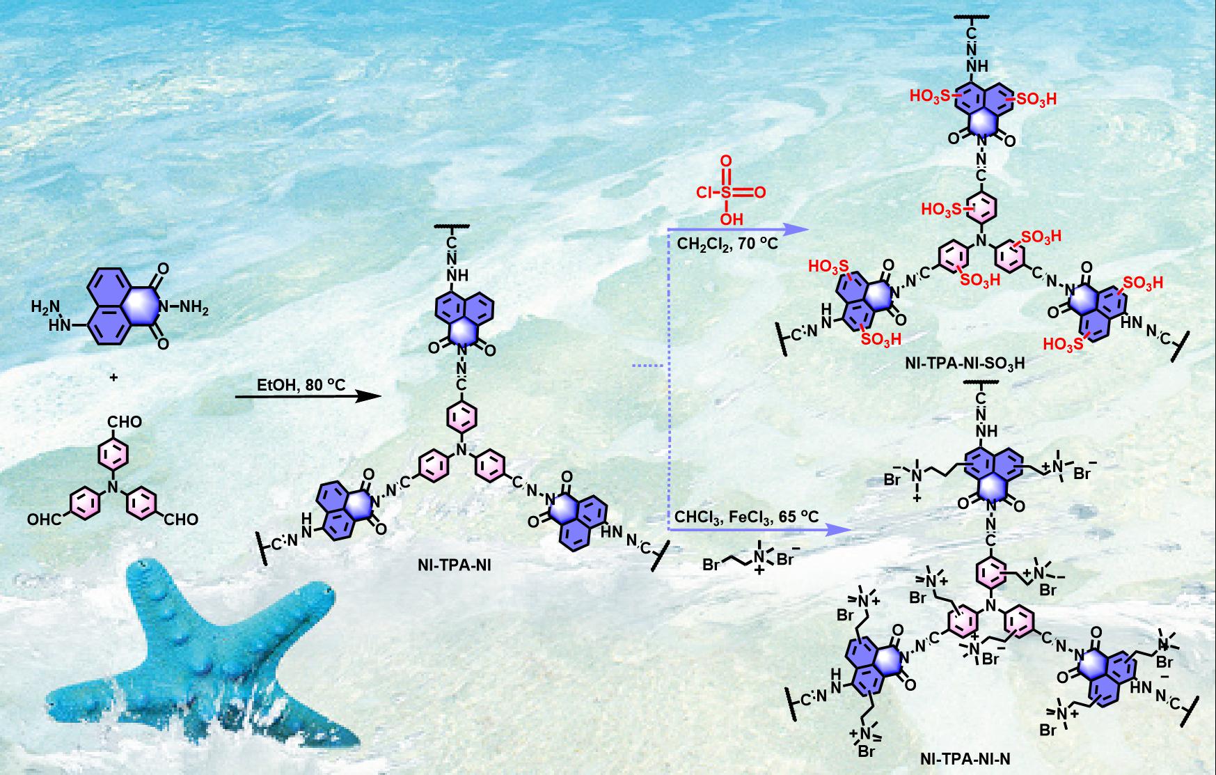 • 過(guò)氧化氫(H2O2)是重要的化學(xué)品,光催化技術(shù)有望替代傳統(tǒng)的蒽醌法,實(shí)現(xiàn)綠色環(huán)保地高效生產(chǎn)H2O2。近期,顧培洋教授團(tuán)隊(duì)和劉廣峰教授合作,研發(fā)了一系列新型共軛多孔聚合物光催化劑,在該領(lǐng)域取得重要進(jìn)展:通過(guò)引入磺酸基,改善了聚合物的親水性和氧氣吸附能力,同時(shí)提升了光生載流子的分離效率以及電子/質(zhì)子的傳輸效率,從而實(shí)現(xiàn)H2O2的高效生成。以乙二胺四乙酸二鈉鹽作為空穴犧牲劑,其生產(chǎn)H2O2速率更是顯著提升,達(dá)到14.5 mmol g?1h?1,優(yōu)于多數(shù)已報(bào)道的半導(dǎo)體光催化劑。相關(guān)工作以“Functionalized Modification of Conjugated Porous Polymers for Full Reaction Photosynthesis of H2O2”為題發(fā)表在國(guó)際頂級(jí)期刊《Advanced Functional Materials》上(Adv. Funct. Mater. 2024, 2415244)。圖1 共軛多孔聚合物光催化劑結(jié)構(gòu)示意圖圖2 ORR和WOR反應(yīng)機(jī)理示意圖此外,周仕元博士在疏水型高比表面積超交聯(lián)聚合物生產(chǎn)H2O2 (Sep. Purif.Te