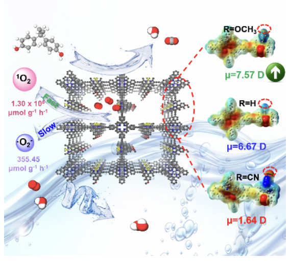 • 高級(jí)氧化過(guò)程(AOPs)通過(guò)光催化降解技術(shù)有效礦化有機(jī)污染物,其中共軛多孔聚合物(CPPs)因其卓越的半導(dǎo)體性能成為研究熱點(diǎn)。然而,氧氣(O2)活化效率低是提升光催化效果的關(guān)鍵挑戰(zhàn),優(yōu)化CPPs的O2吸附與活化選擇性對(duì)于推進(jìn)光催化技術(shù)的實(shí)際應(yīng)用至關(guān)重要。近期,顧培洋教授團(tuán)隊(duì)和劉廣峰教授合作,研發(fā)了一系列新型共軛多孔聚合物光催化劑,在該領(lǐng)域取得重要進(jìn)展:通過(guò)引入卟啉與BODIPY雙重光敏劑到D-π-A(供體-π-受體)構(gòu)型的共軛多孔聚合物(CPPs)中,協(xié)同化學(xué)微環(huán)境調(diào)控(-OCH3,H和CN取代基)獲得高效光催化性能。BDP-Por-O光催化劑選擇性生成單線(xiàn)態(tài)氧(1O2)的能力可推升至驚人的1.30 × 10? μmol g?1 h?1,這一數(shù)值高達(dá)超氧自由基(·O2?)產(chǎn)量的103,使其在雙酚A(BPA)降解方面展現(xiàn)出革命性的高效性,分別在短短2分鐘便能將10 ppm及20分鐘內(nèi)將100 ppm的BPA徹底降解為無(wú)害物質(zhì)。此外,光催化過(guò)氧化氫(H2O2)的生成效率在無(wú)任何添加劑下同樣達(dá)到令人矚目的987 μmol g-1h-1。該研究以題為“Selective Oxygen Acti