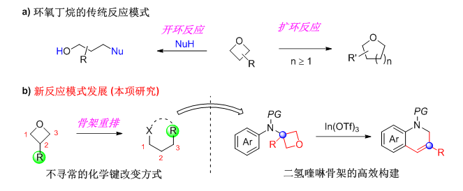 最近我校石油化工學(xué)院新引進的青年教師黃海博士與孫建偉教授在Angew. Chem. Int. Ed.上共同發(fā)表題為Unusual Skeletal Reorganization of Oxetanes for the Synthesis of 1,2-Dihydroquinolines的研究論文。骨架重排是有機化學(xué)中重要且有趣的反應(yīng)模式,它能夠構(gòu)建出很多復(fù)雜但實用價值很高的有機分子骨架。因此,探索特殊官能團骨架重排反應(yīng),揭示其反應(yīng)規(guī)律是有機合成中重要的研究方向。本論文實現(xiàn)了一種關(guān)于環(huán)氧丁烷特殊骨架重排反應(yīng),這是繼環(huán)氧丁烷傳統(tǒng)開環(huán)和擴環(huán)反應(yīng)方式上的一次全新的反應(yīng)模式突破。通過本骨架重排策略,能夠高效快速的構(gòu)建二氫喹啉骨架。后期應(yīng)用顯示,目標(biāo)分子具有很高的合成價值,是一類不可或缺的骨架結(jié)構(gòu)。