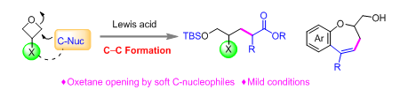 我校石油化工學(xué)院黃海、孫建偉團(tuán)隊(duì)一直致力于氧雜環(huán)丁烷的功能性轉(zhuǎn)化研究,通過利用氧雜環(huán)丁烷特殊親電性,從而實(shí)現(xiàn)一系列具有較高價(jià)值的有機(jī)分子骨架。近日,黃海、孫建偉團(tuán)隊(duì)通過利用烯醇硅醚作為軟碳親核試劑,成功地實(shí)現(xiàn)了氧雜環(huán)丁烷的碳開環(huán)反應(yīng)。此項(xiàng)工作避開了傳統(tǒng)的金屬試劑,在軟碳親核試劑方面取得了完全新穎的突破,反應(yīng)所構(gòu)建的產(chǎn)物4-羥基酯更是一類在全合成領(lǐng)域具有巨大應(yīng)用的分子骨架。通過巧妙的分子設(shè)計(jì),同樣的策略成功地應(yīng)用到了分子內(nèi)碳開環(huán)反應(yīng)中,為天然產(chǎn)物骨架benzo[b]oxepine提供了全新的構(gòu)建策略。這項(xiàng)研究不僅是兩個(gè)著名的有機(jī)人名反應(yīng)Mukaiyama Aldol和Prins Reaction的延伸,也為氧雜環(huán)丁烷開環(huán)反應(yīng)提供了新的思路。