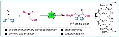 孫江濤團(tuán)隊(duì)發(fā)展了一種以烯酮和N,O-縮醛為原料,在手性磷酸催化下實(shí)現(xiàn)了烯酮的不對(duì)稱胺甲基化,從而簡(jiǎn)潔、高效、綠色合成光學(xué)純的β2,2-氨基酸的新方法。