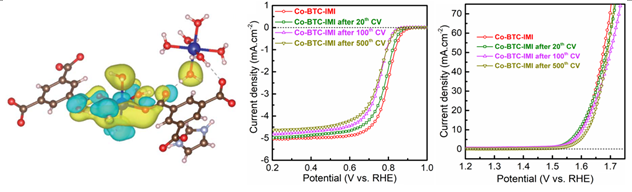 純相金屬有機骨架(MOFs)在催化領(lǐng)域具有巨大的應(yīng)用潛力,但是由于這類材料的導(dǎo)電性不夠高,在能源轉(zhuǎn)換和存儲電催化領(lǐng)域中應(yīng)用受到的限制。銀鳳翔、陳標華課題組理論計算研究發(fā)現(xiàn),MOFs中的不飽和配位能降低空間位阻,促進活性中心與水分子和氧氣分子的相互作用,降低電子傳導(dǎo)阻力,提高材料的導(dǎo)電性,使得這種MOFs在電催化中具有增強的質(zhì)量傳遞和電子傳遞特性。根據(jù)這一發(fā)現(xiàn),課題組采用鈷離子、均苯三甲酸和咪唑通過水熱反應(yīng)合成了金屬有機骨架Co-BTC-IMI,該材料中的一個Co離子分別被兩個去質(zhì)子化的均苯三甲酸連接,構(gòu)建了Co金屬中心的不飽和配位。該金屬有機骨架在堿性半電池中可提供0.80 V(參比可逆氫電極)的氧氣還原反應(yīng)半波電勢,并在10 mA·cm-2電流密度下提供了1.59 V(參比可逆氫電極)的氧氣析出反應(yīng)電勢。該工作在將純相MOFs直接應(yīng)用于氧氣電催化領(lǐng)域中取得了突破性進展,為能源轉(zhuǎn)換和存儲科學(xué)和技術(shù)的發(fā)展提供了新的思路。近日,該成果已經(jīng)發(fā)表于國際頂級期刊Journal of Materials Chemistry A上。此項工作得到了江蘇省綠色催化重點實驗室、江蘇省自然科學(xué)基金以及國家自然科學(xué)基金的資助。