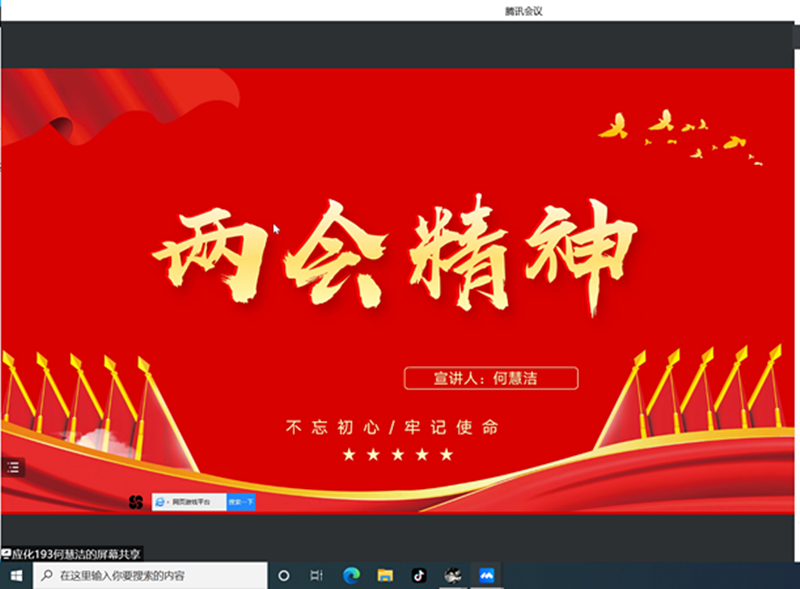 為進(jìn)一步增強(qiáng)青年學(xué)生對(duì)全國(guó)兩會(huì)內(nèi)容的理解和領(lǐng)悟,深刻學(xué)習(xí)2022年全國(guó)兩會(huì)精神,4月11日,我院組織青年學(xué)習(xí)宣講活動(dòng)。本次活動(dòng)由青年講師團(tuán)成員應(yīng)化193何慧潔主講。