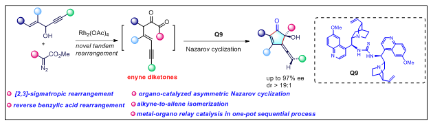 我們發(fā)展了一種金屬-有機接力催化策略即:金屬銠催化重氮和烯炔醇經(jīng)過串聯(lián)重排反應(yīng)得到烯炔二酮(enyne diketones), 烯炔二酮作為新穎的Nazarov反應(yīng)底物在手性催化劑的催化下,高對映和非對映選擇性制備一系列手性聯(lián)烯環(huán)戊烯酮。