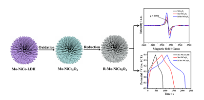近年來,過渡金屬氧化物以其可變的氧化價態(tài),成本低廉,易于制備而引起廣泛關(guān)注。此外,鑒于過渡金屬氧化物的理論比電容較高且電活性較好,故而在儲能領(lǐng)域具有重要地位。在本工作中,課題組提出了一種雙缺陷工藝構(gòu)建富含氧空位和Mo摻雜的NiCo2O4(R-Mo-NiCo2O4)。通過NaBH4還原在NiCo2O4晶格中產(chǎn)生氧空位缺陷,在材料中產(chǎn)生更多的載流子,使更多活性物質(zhì)參與電化學(xué)氧化還原反應(yīng)過程。此外,氧空位和Mo摻雜的協(xié)同作用不僅提高了材料的導(dǎo)電性,而且豐富了氧化還原動力學(xué)。將通過氧空位和Mo摻雜雙缺陷工藝制備得到的R-Mo-NiCo2O4用做超級電容器電極,在電流密度1 A g?1下比容量高達(dá)285.8 mAh g?1,且具有較好的倍率性能及循環(huán)穩(wěn)定性。該電極材料優(yōu)異的性能可歸因于R-Mo-NiCo2O4較大的比表面積可增加其與電解質(zhì)的接觸面積,實現(xiàn)電解質(zhì)充分?jǐn)U散的同時縮短了電荷轉(zhuǎn)移的擴(kuò)散路徑;Mo元素的引入促進(jìn)了電荷轉(zhuǎn)移,提高了R-Mo-NiCo2O4的導(dǎo)電性,同時Mo元素的引入有助于形成氧空位缺陷,促進(jìn)離子在電極中的擴(kuò)散;經(jīng)NaBH4還原后,氧空位缺陷的數(shù)量可進(jìn)一步增加,提升了該電極材料的電化學(xué)性能。該成果于近日發(fā)表于化學(xué)領(lǐng)域著名期刊Chemical Communications (2022, 58, 5120–5123)。
