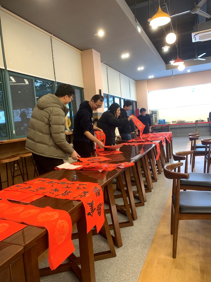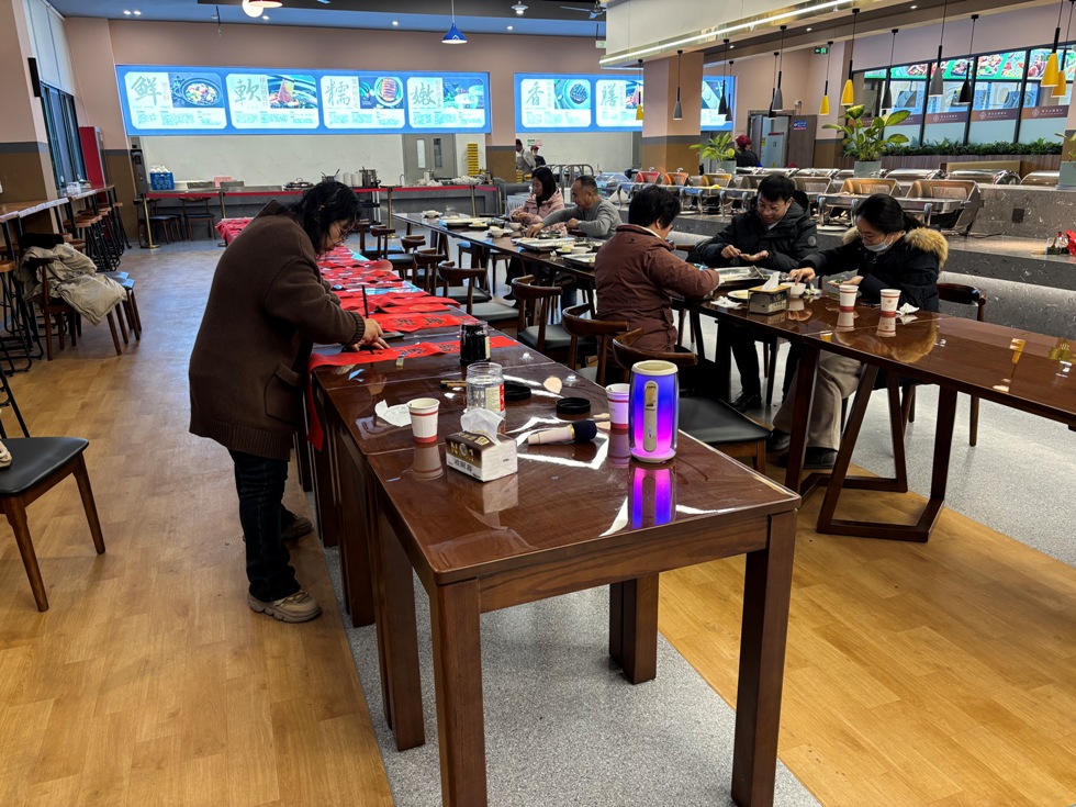 活動(dòng)現(xiàn)場(chǎng),董燕敏老師為在場(chǎng)教職工現(xiàn)場(chǎng)寫(xiě)春聯(lián)、送“?!弊郑环鶟鉂饽晡兜南矐c“春聯(lián)”和“?!弊?,還未晾干,就被熱情的職工們“一搶而空”。