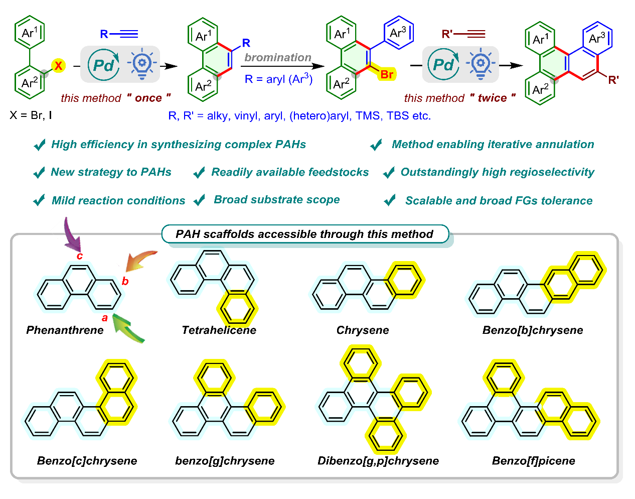 多環(huán)芳烴(PAHs)因其獨特的π-共軛結(jié)構(gòu),在有機電子學、光電器件和藥物化學中扮演著關(guān)鍵角色。從OLED顯示器中的發(fā)光材料,到潛在的超導分子,再到天然產(chǎn)物中的活性骨架,PAHs的分子結(jié)構(gòu)直接決定了它們的功能表現(xiàn)。然而,傳統(tǒng)合成方法往往依賴高溫、多步反應或貴金屬催化,不僅效率低、成本高,還常因副反應多而難以精準控制分子結(jié)構(gòu)。尤其當需要構(gòu)建復雜、擴展型PAH骨架時,化學家們面臨“步驟多、產(chǎn)率低、選擇性差”的三重困境。因此,開發(fā)一種步驟簡潔、條件溫和、可模塊化拓展的新策略,成為材料化學與合成化學共同亟待突破的科學問題。