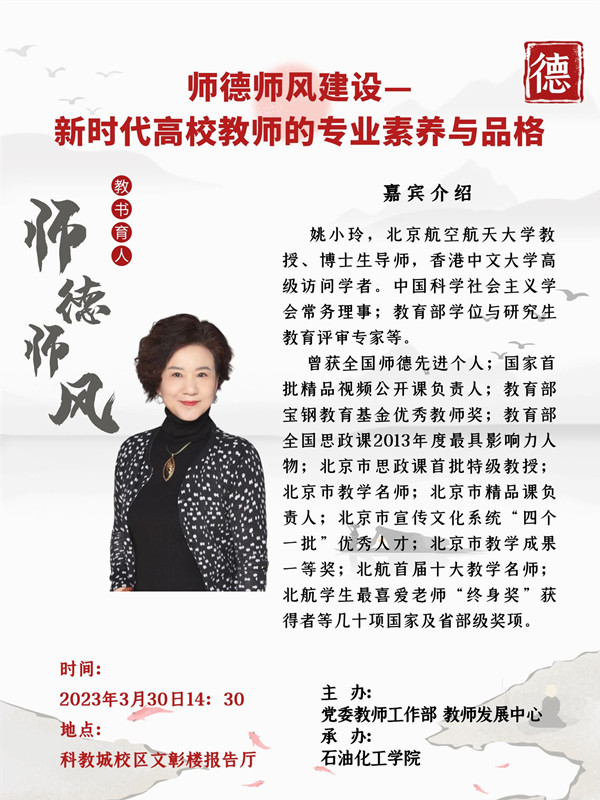 | 【學(xué)術(shù)講座】師德師風(fēng)建設(shè)——新時(shí)代高校教師的專業(yè)素養(yǎng)與品格 姚小玲 北京航空航天大學(xué)教授 |