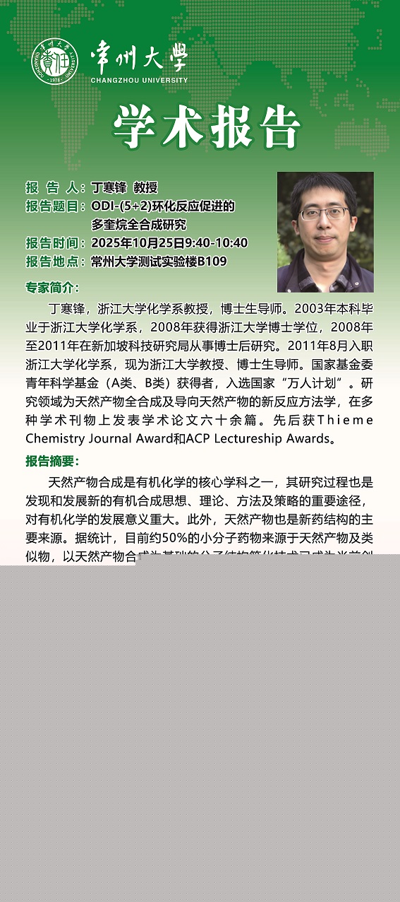 【學(xué)術(shù)報告】10月25日功能雜環(huán)研究院學(xué)術(shù)報告——丁寒鋒教授 浙江大學(xué) 顧振華教授 中國科學(xué)技術(shù)大學(xué)