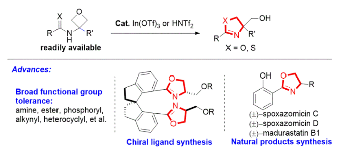 A Mild Catalytic Synthesis of 2-Oxazolines via Oxetane Ring-Opening: Rapid Access to A Diverse Family of Natural Products Hai Huang,Wen Yang,Zuliang Chen,Zengwei Laiand Jianwei Sun* 近日,孫建偉和黃海教師課題組在化學(xué)國(guó)際頂級(jí)刊物Chemical Science上發(fā)表題為“A Mild Catalytic Synthesis of 2-Oxazolines via Oxetane Ring-Opening: Rapid Access to A Diverse Family of Natural Products”的研究論文。論文通訊聯(lián)系人為孫建偉教授,第一作者為石油化工學(xué)院新進(jìn)青年教師黃海博士。噁唑啉類化合物在生物活性分子以及金屬配體中都有廣泛的應(yīng)用。關(guān)于該類化合物的合成目前只能依賴于非催化地胺基醇或者N-烯丙基甲酰胺類化合物的環(huán)合反應(yīng)。該工作巧妙地將甲酰胺鍵引入到氧雜環(huán)丁烷分子中從而實(shí)現(xiàn)其分子內(nèi)開環(huán)反應(yīng)。該方法發(fā)展了一種催化合成噁唑啉環(huán)的方法,同時(shí)兼具條件溫和、高效性、優(yōu)越的官能團(tuán)容忍性等優(yōu)點(diǎn)。通過該方法不僅能夠?qū)崿F(xiàn)新型手性配體地合成,同時(shí)能夠快速地合成系列天然產(chǎn)物包括(±)-Spoxazomicin C, (±)-Madurastatin B1和(±)-Spoxazomicin D。 Chemical Science是是英國(guó)皇家化學(xué)會(huì)(RSC)旗艦刊物,2019年影響因子為9.556。中科院分區(qū)為一區(qū),TOP及Nature Index刊物。該期刊發(fā)表綜合化學(xué)領(lǐng)域的高水平論文,致力于為化學(xué)領(lǐng)域研究人員的學(xué)術(shù)觀點(diǎn)和學(xué)術(shù)信息交流提供一個(gè)國(guó)際化、高質(zhì)量的學(xué)術(shù)交流期刊平臺(tái)。